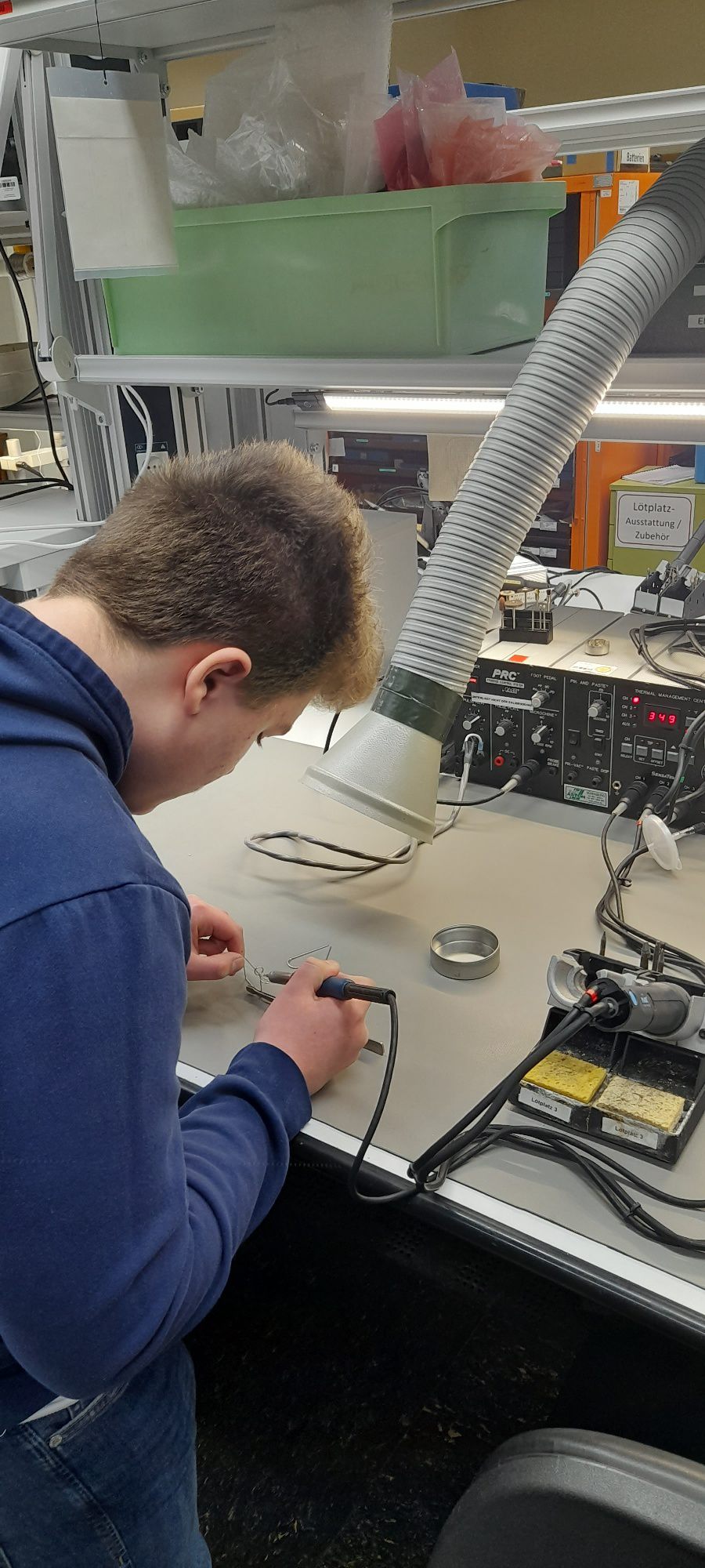 Im ersten Teil des Nachmittags stand die berufliche Praxis im Vordergrund. Die Schülerinnen und Schüler erhielten nicht nur einen Einblick in den Standort des Instandsetzungszentrums 13, sondern durften selber Hand anlegen: An vorbereiteten Arbeitsplätzen absolvierten alle eine Lötübung. Diese praktische Erfahrung verdeutlichte, dass technische Präzision das Fundament der Luftwaffen-Arbeit bildet, denn das Instandsetzungszentrum 13 ist ein Kompetenz- und Wartungszentrum für Avionik-Systeme, also die elektronischen und optoelektronischen Geräte von Luftfahrzeugen der Bundeswehr. Es ist spezialisiert auf die Reparatur, Überholung und den Erhalt dieser komplexen Bauteile.