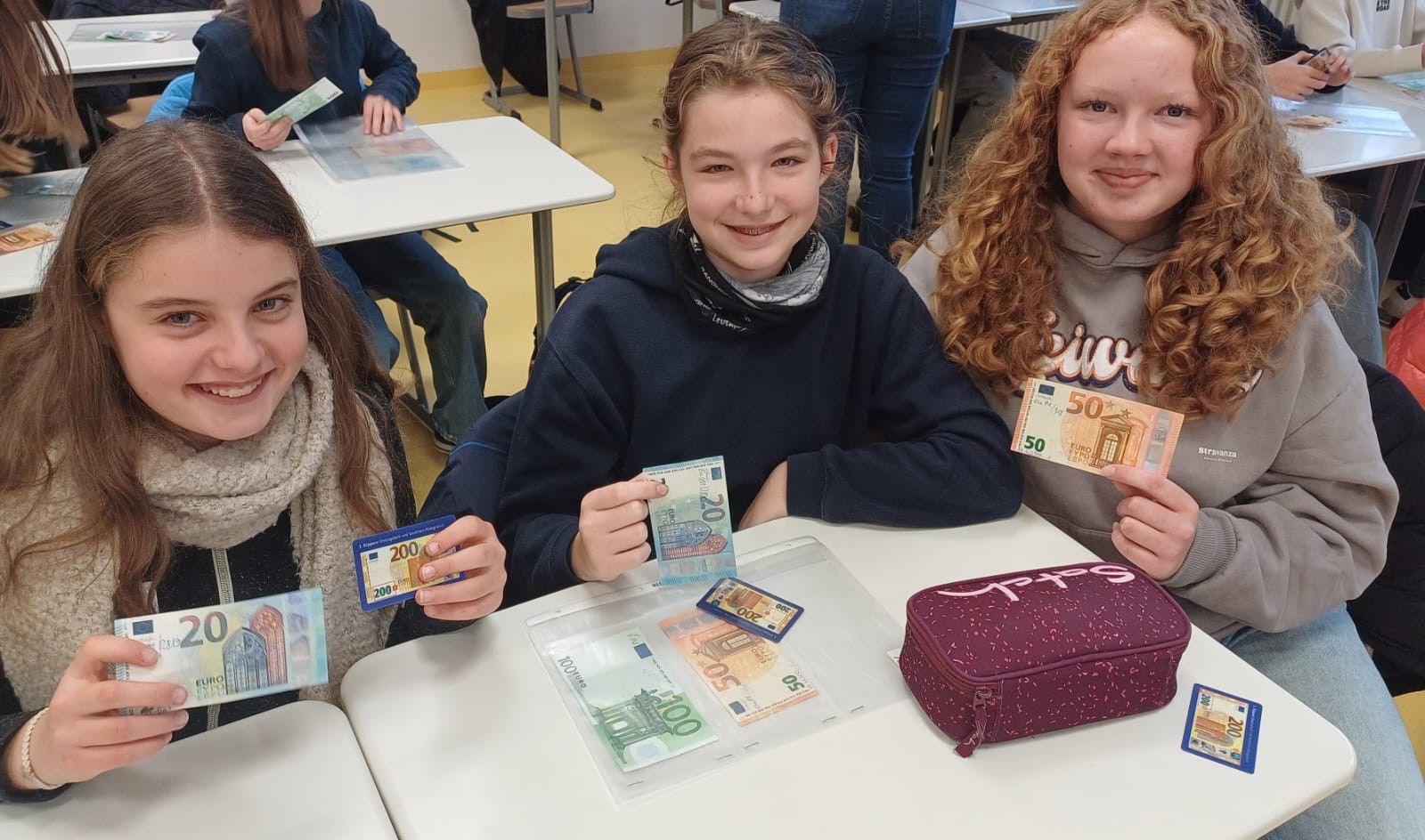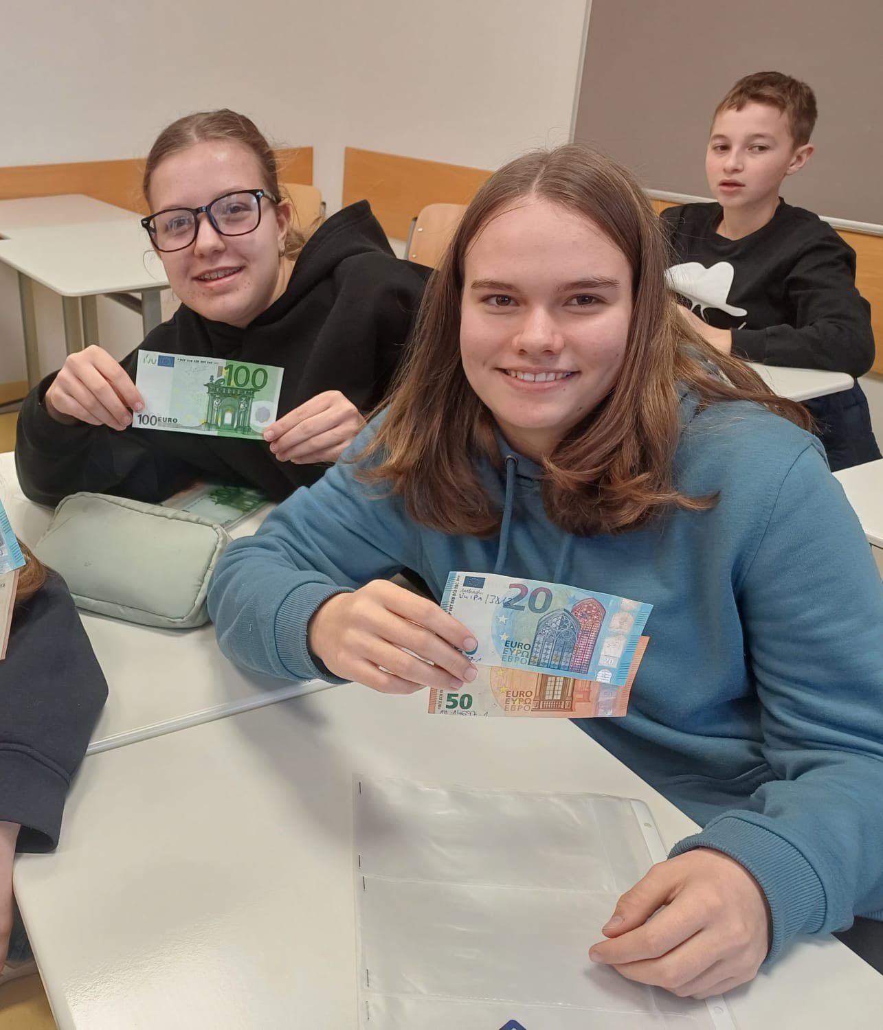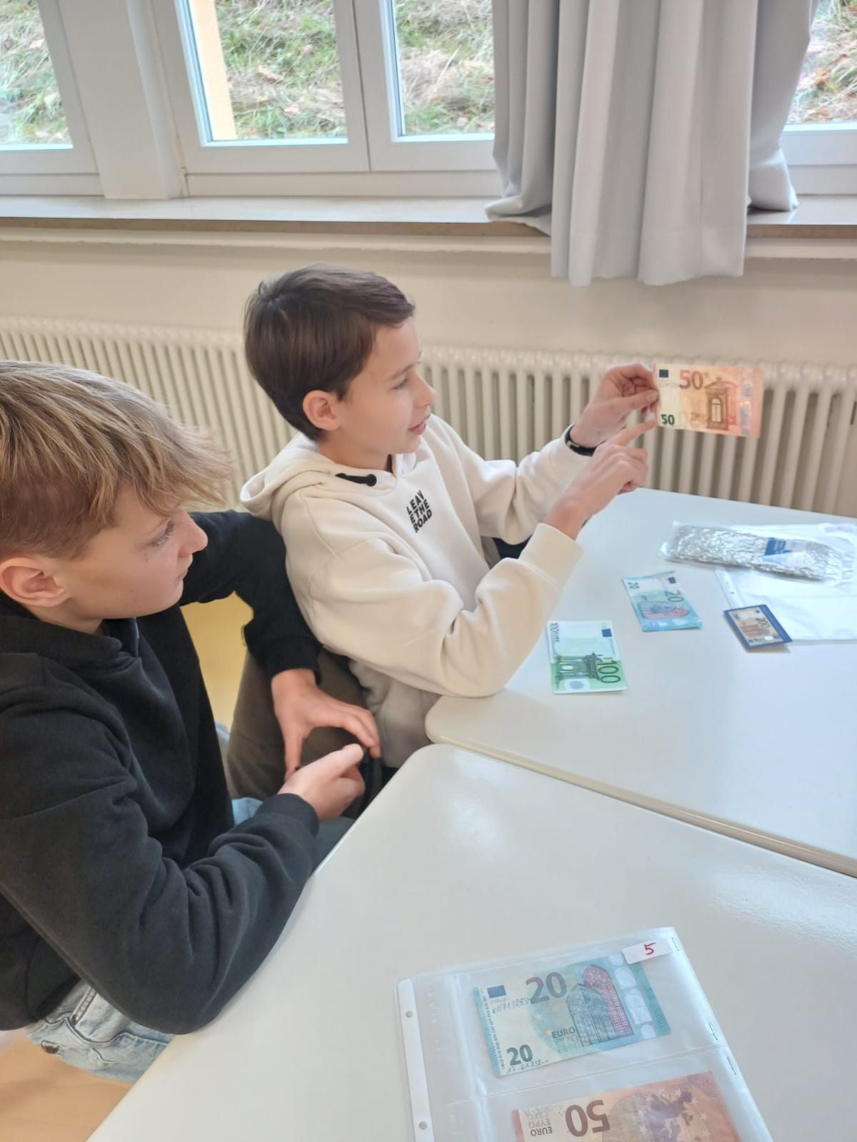 Dabei erhielten die Schülerinnen und Schüler nicht nur theoretische Einblicke in die Aufgaben der Bundesbank, sondern konnten auch selbst aktiv werden. Anhand „echter“ Falschgeldscheine untersuchten sie Sicherheitsmerkmale von Banknoten ganz genau und lernten, woran sich Fälschungen erkennen lassen. Mit prüfendem Blick wurden Wasserzeichen, Hologramme und Sicherheitsfäden kontrolliert – und so mancher war überrascht, wie raffiniert Fälschungen gemacht sein können.